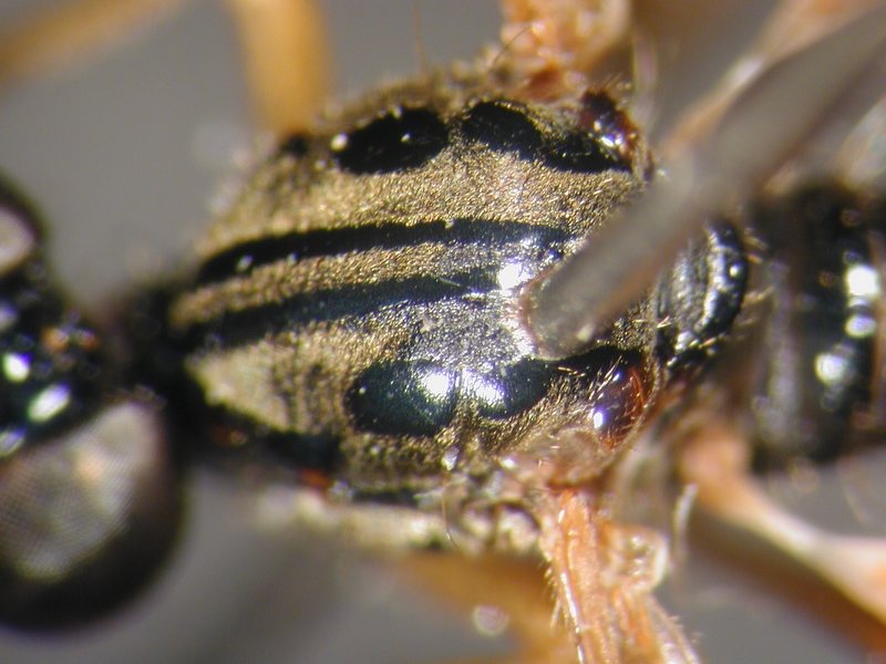 Bestäubung auf den Pleuren bildet einen fast vollständigen Ring oder fehlt auf dem Anepisternum [Abb. 3], [Abb. 4] (rot markiert)