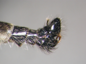 Tergit 6 ebenso wie Tergit 7 überwiegend unbestäubt und stark glänzend [Abb. 2], [Abb. 3]